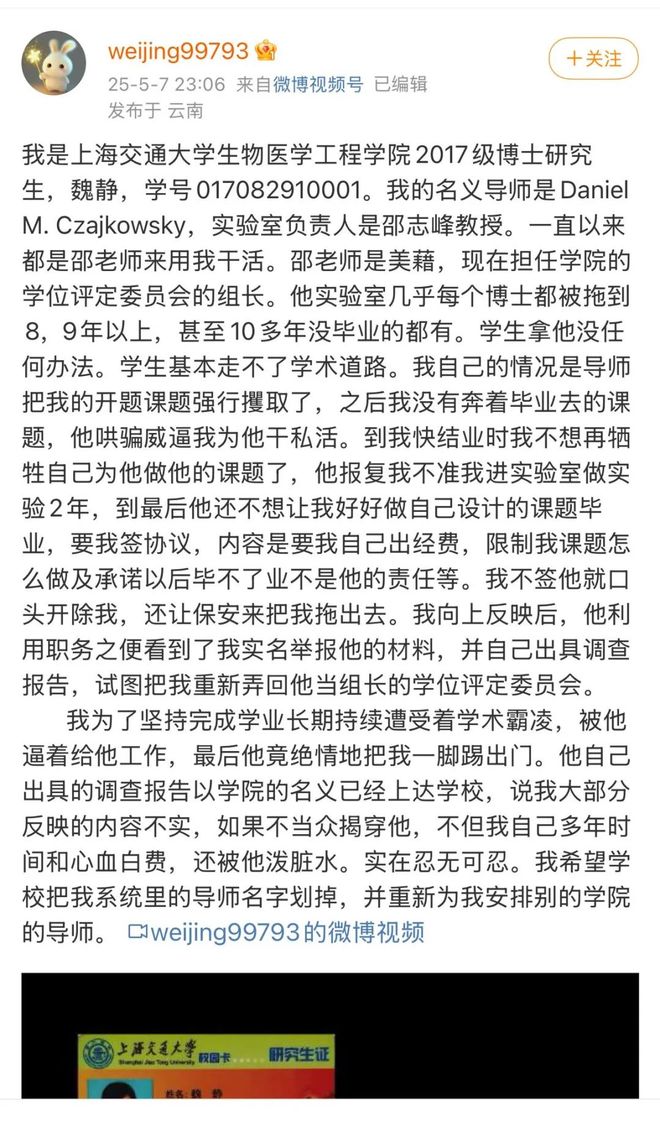 同样在今天,我看到微博上有个举报帖子,来自上海交大的一位2017级博士研究生实名举报自己的导师,长期以个人意志凭借担任学位评定委员会组长之便,拖延旗下实验组博士研究生,且几乎每位都被拖至8、9年之长,甚至10多年没毕业的也有。
