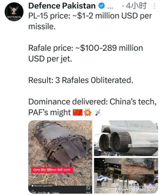巴基斯坦为做这波广告也是拼了。巴国防部在X上发文称,PL-15每枚约100-200万美元,阵风价格约1-1.89亿美元。结果3架阵风被PL-15消灭。统治力的展现就在于:中国的技术,老巴的力量。
