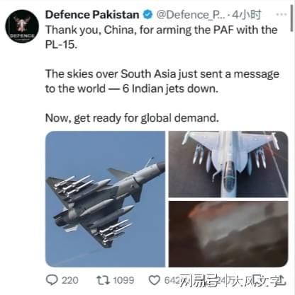 巴基斯坦人已经开始在国外媒体上感谢中国的武器装备了,并提醒中国军工产业准备迎接全球订单。而印度一直沉默,就说明真是吃了大亏了,但凡能占一点便宜都谁都憋不住。一位网友说:霹雳15必须得涨价,不能再卖白菜价啦!